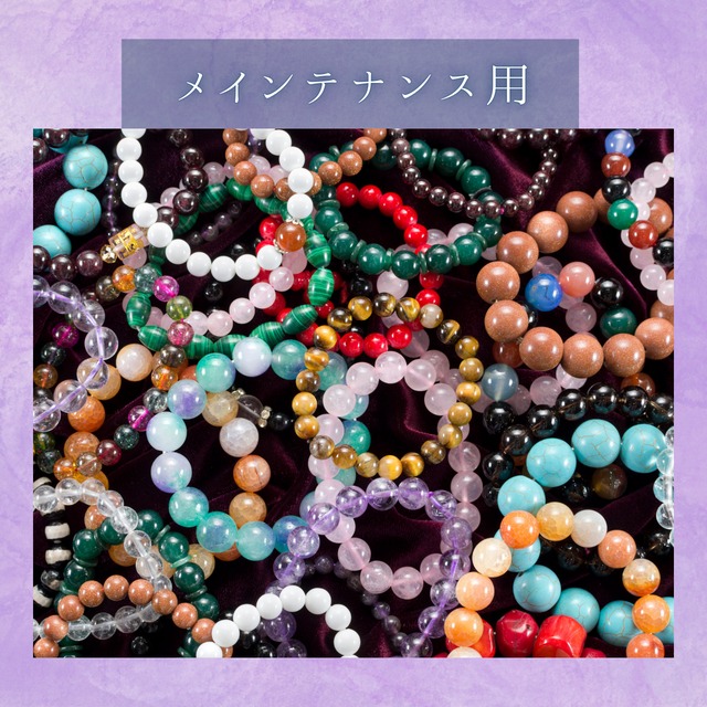 【商品説明文】 お手元のブレスレットを、 より快適に、より美しくお使いいただくための メンテナンス専用ページです。 サイズ感の微調整やゴムの交換など、 日常使いの中で生じる小さな違和感や、 破損してしまったブレスレットを丁寧に整えます。 当店でご購入いただいたブレスレットは、 特別価格にてメンテナンスを承っております。 【対応内容】 ・石に合わせたクリーニングと浄化 (不要な場合のみご連絡ください) ・サイズ調整 (サイズアップ/ダウン対応・石の調整込み) ・ゴム交換 ※作業内容にかかわらず料金は一律です。 ※透明アンタロンゴムのみ使用しております。 ※サイズアップは、使用可能な石が別途ある場合のみ対応可能です。事前にお問い合わせください。 【1ブレスレット毎のお支払い料金】 ・当店ご購入ブレスレット:300円 ・他店ご購入ブレスレット:500円 【ご利用方法】 ①ご希望の内容を、ご購入時の備考欄に ご記入の上ご購入ください。 ②ご購入後、 こちらからお知らせする住所へ 修理対象のお品をお送りください。 (送料はご負担をお願いいたします) ③お品をお預かり後、ご希望の作業を行い、 3〜5営業日ほどで返送いたします。 【注意事項】 ※石のみのブレスレットを受け付けております。 当店購入以外の金属パーツ付きブレスレットは、 メインテナンス対象外です。 ※天然石の特性上、サイズや配置にわずかな個体差が生じることがございます。