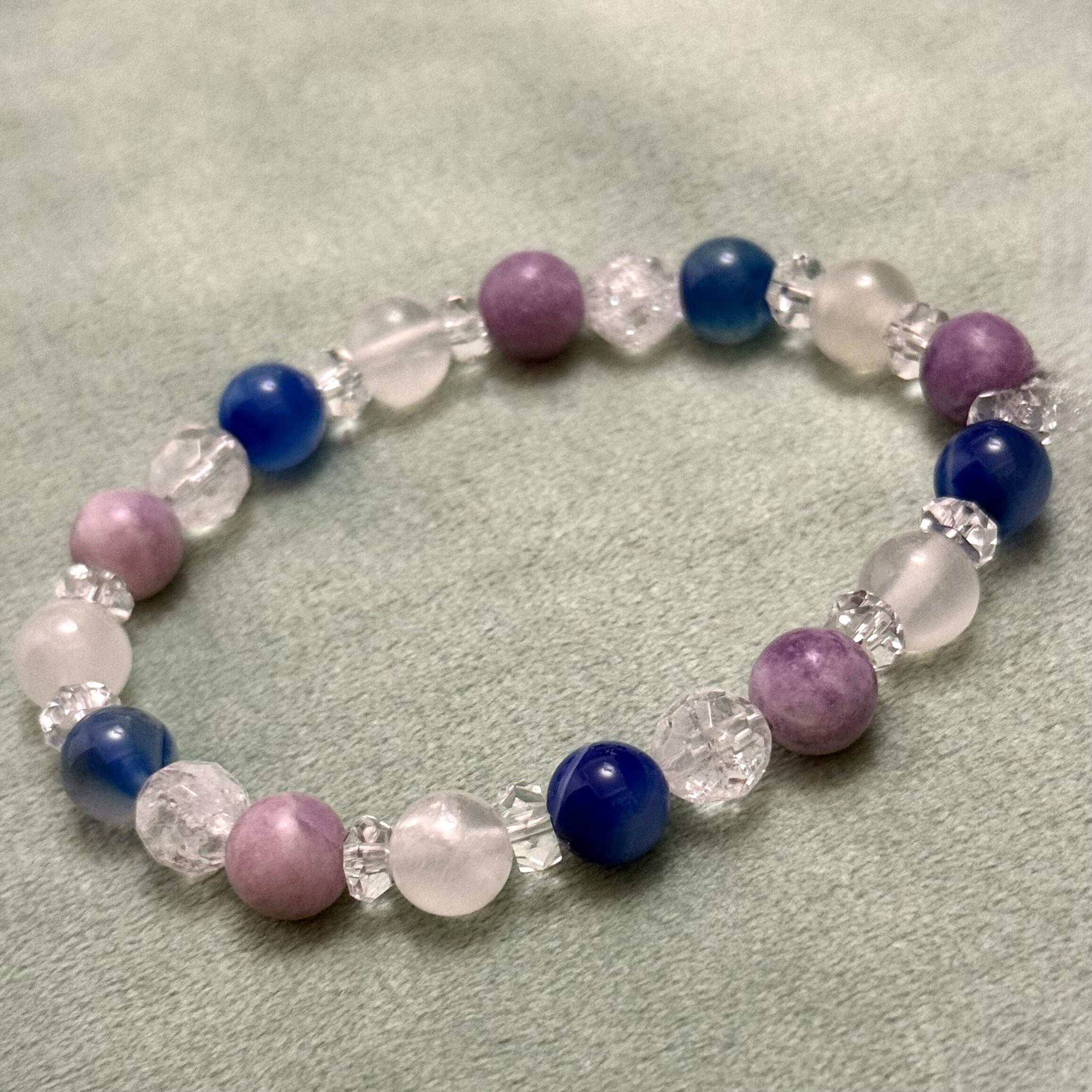 癒しと調和の天然石パワーストーンブレスレット | ホワイトカルセドニー ブルーストライプアゲート ライラックレピドライト 水晶