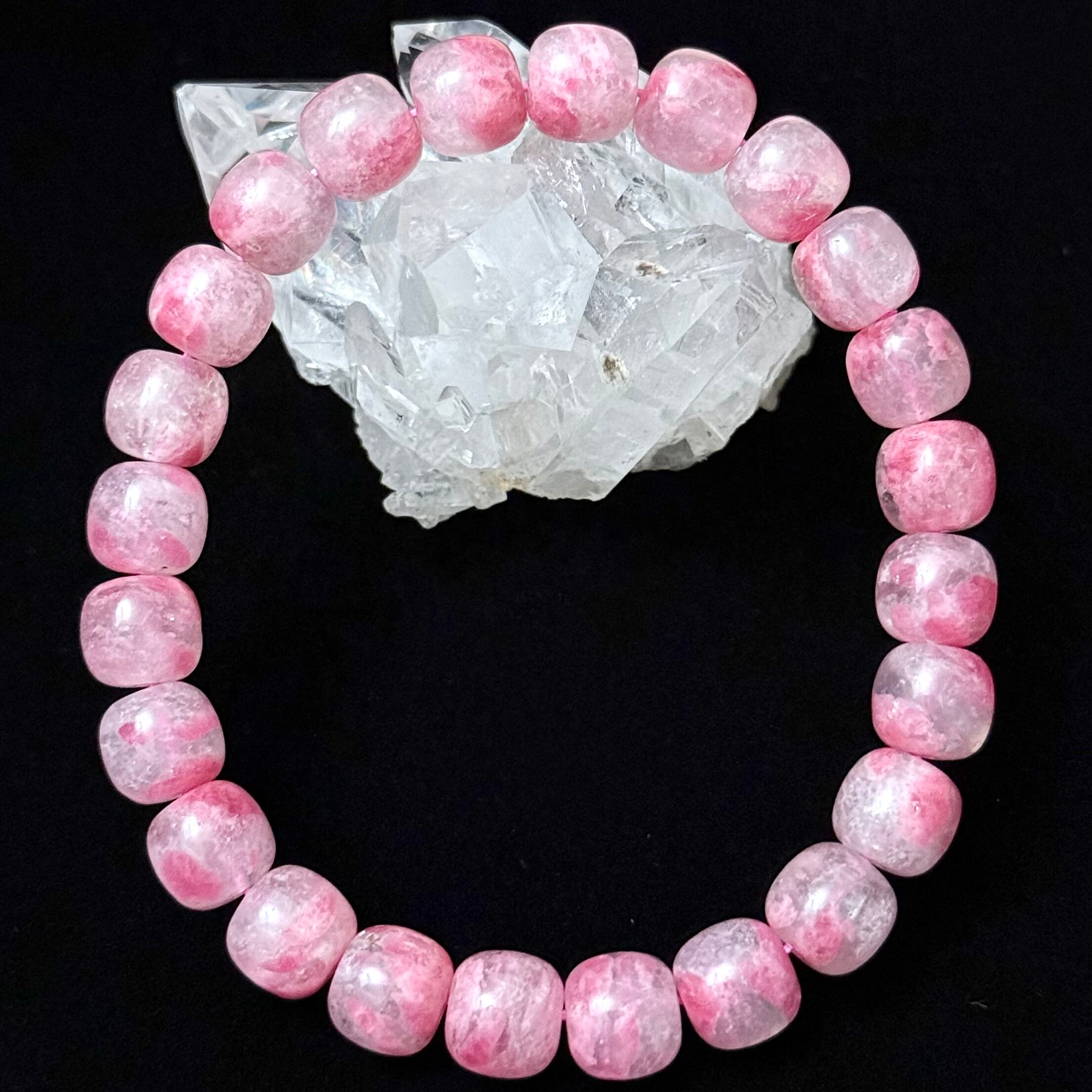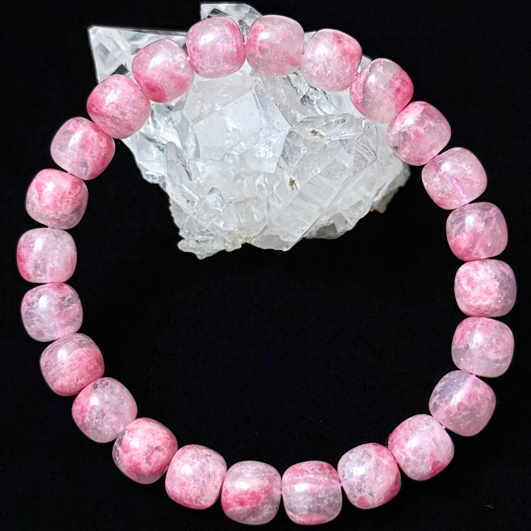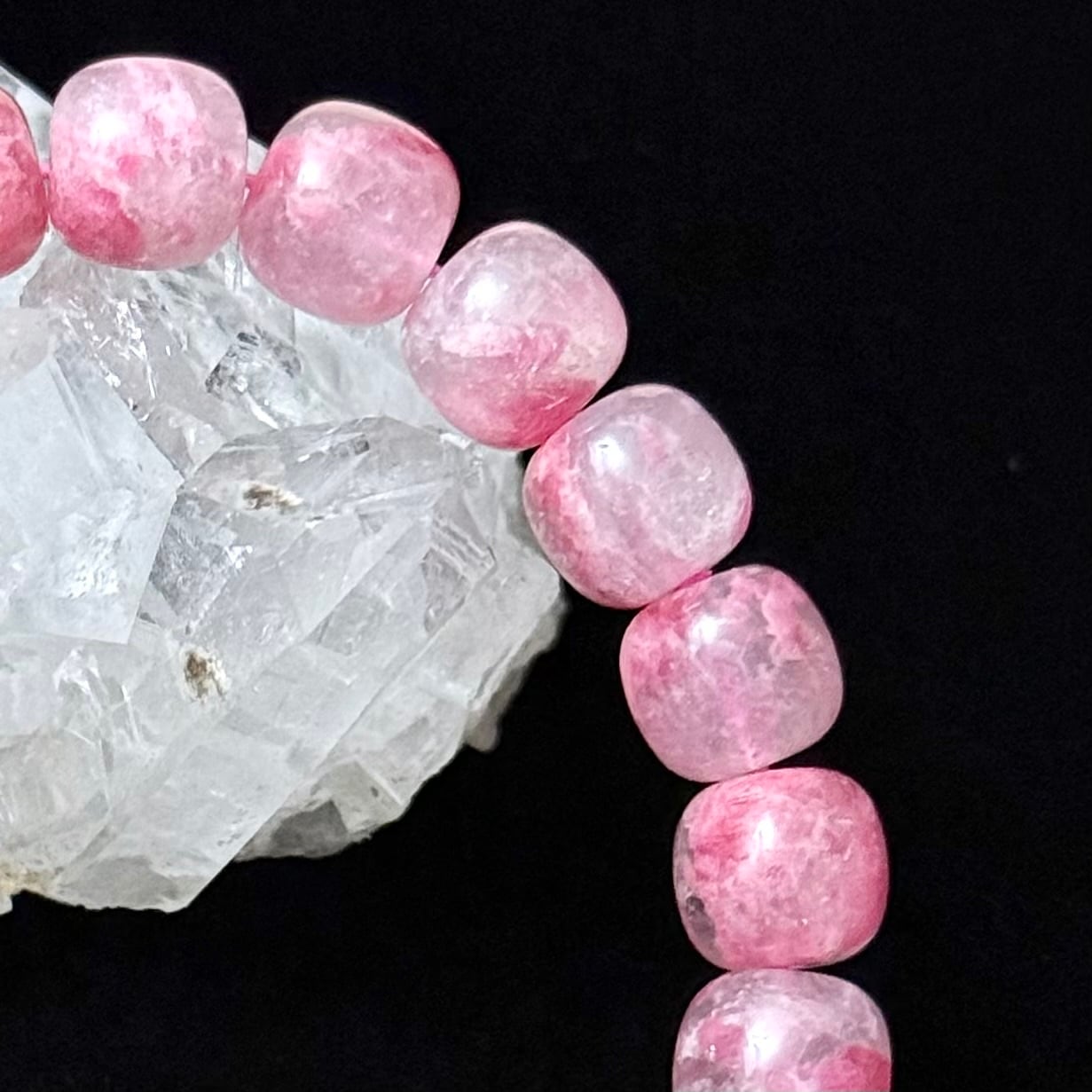 淡いピンクからローズカラーが溶け合うように広がる、ロードナイトシリカのブレスレット。