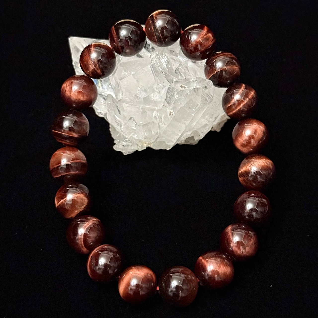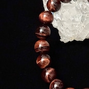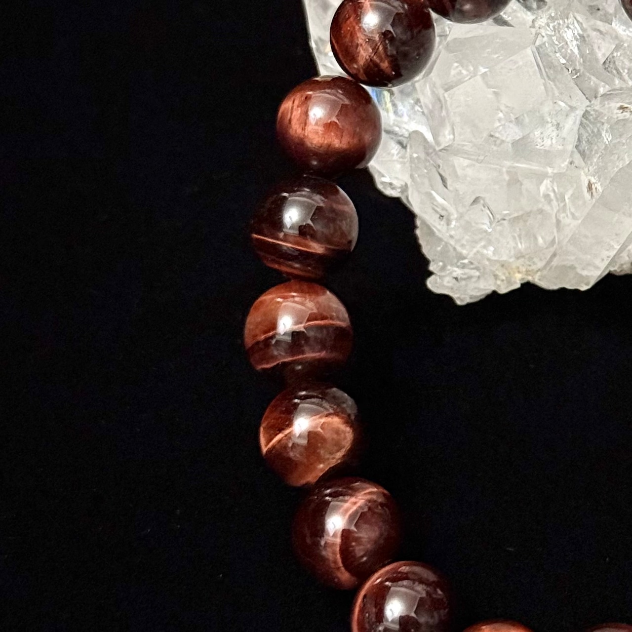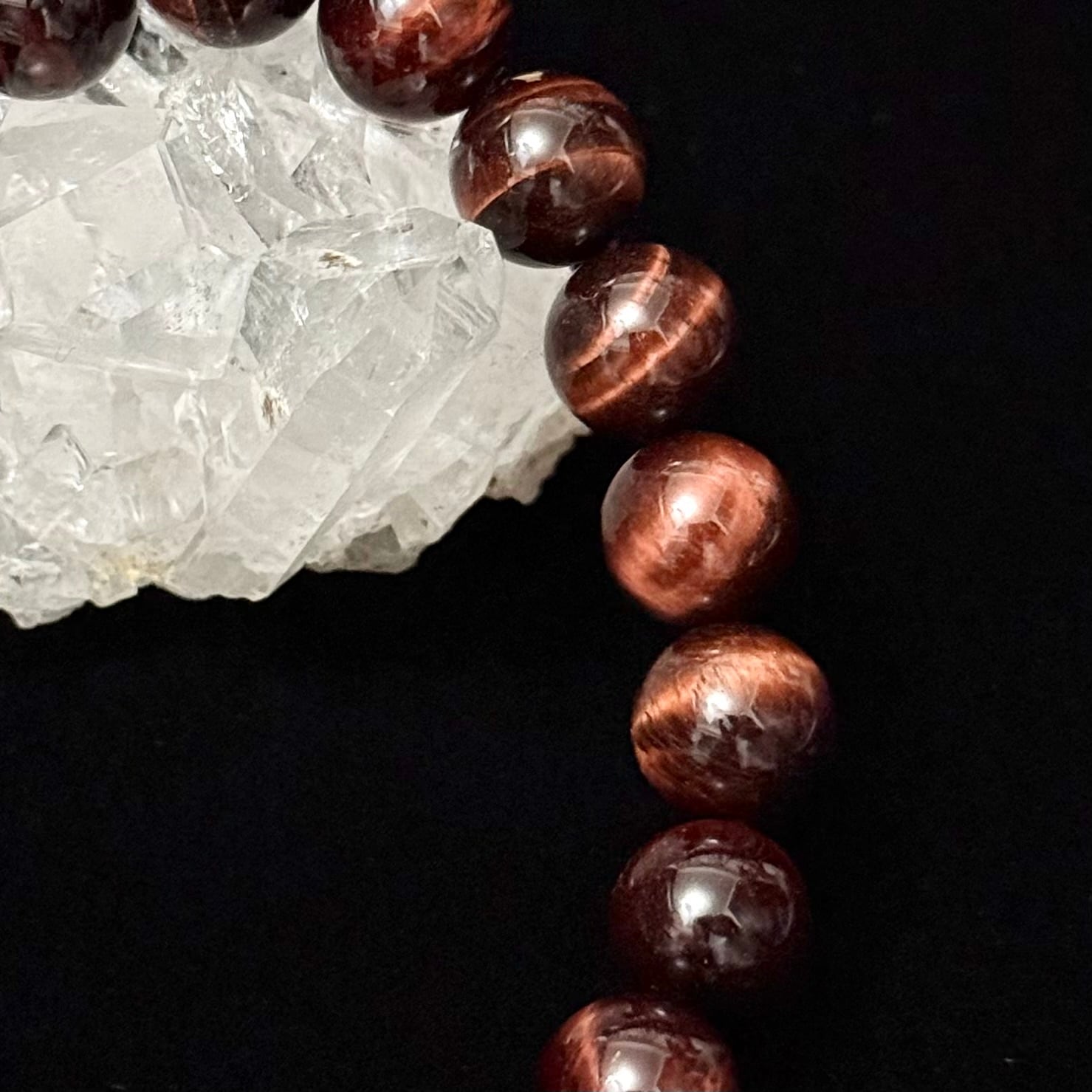 深みのある赤褐色に、虎眼石特有のシャトヤンシー(光の筋)が美しく浮かび上がるレッドタイガーアイのブレスレット。