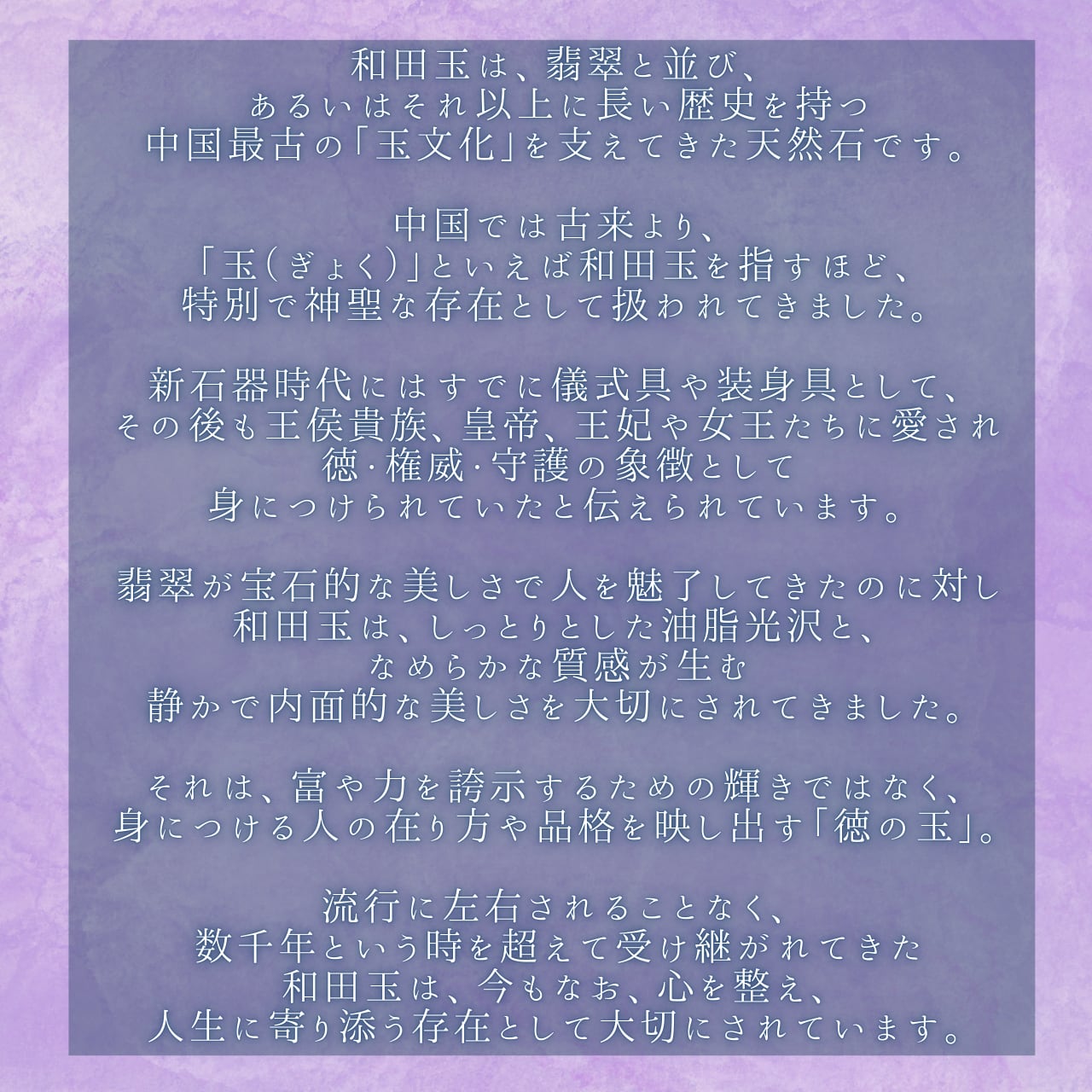 中国の名玉として古来より愛されてきた和田玉は、穏やかで品のある光沢と、しっとりとした質感が特徴です。