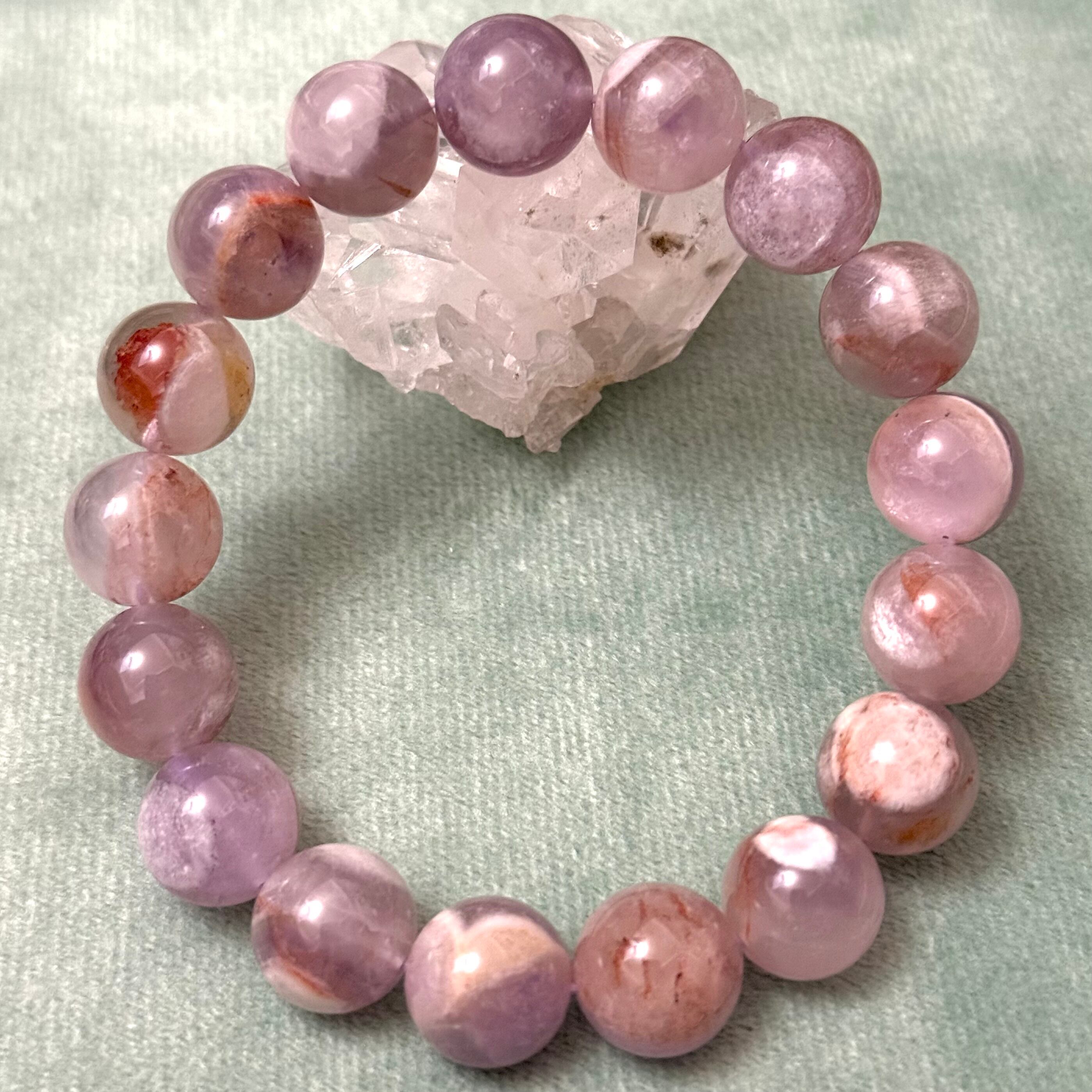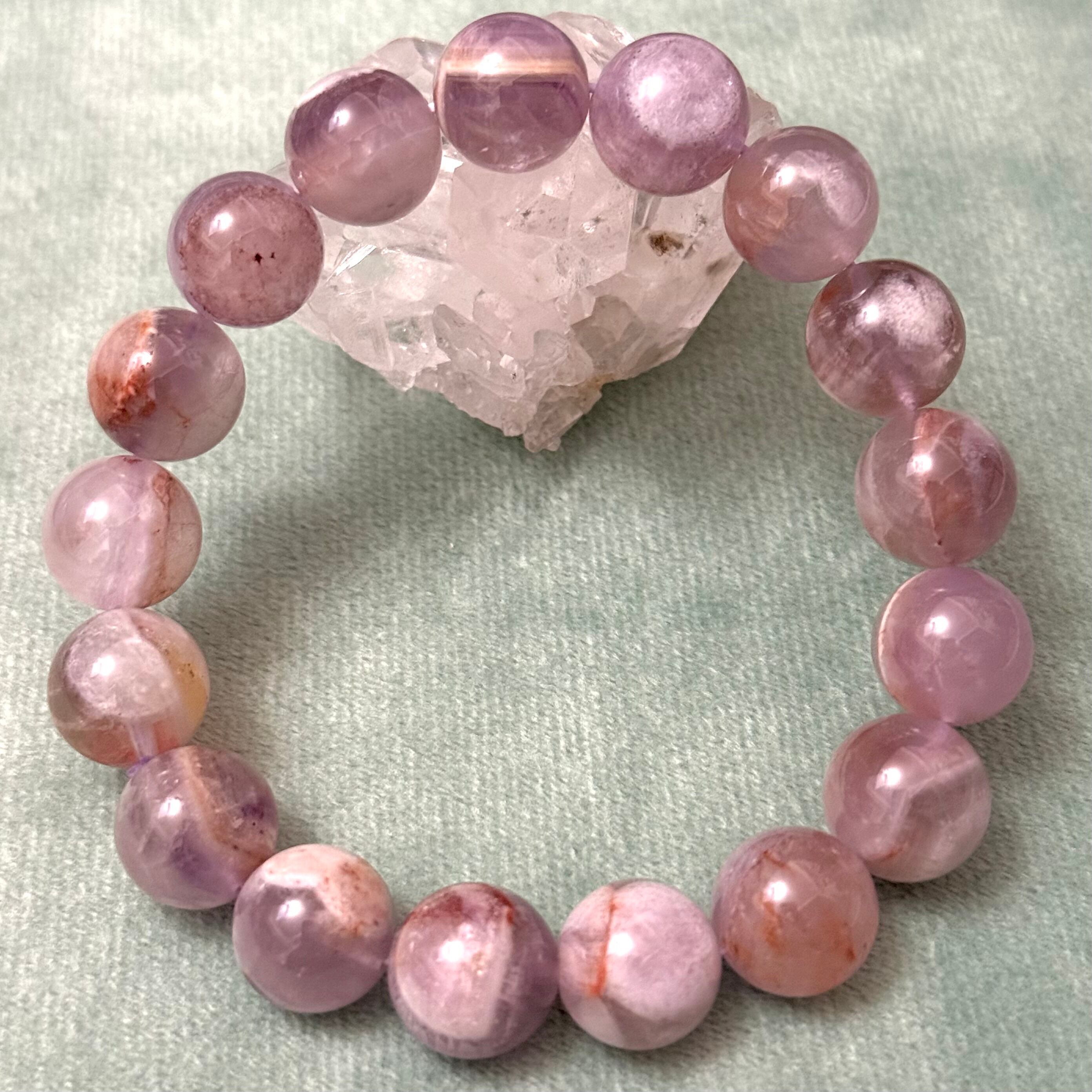 この一本は、ラベンダーアメジストの中に見られる、赤みを帯びた内包物が特徴的なマイカインアメジスト。